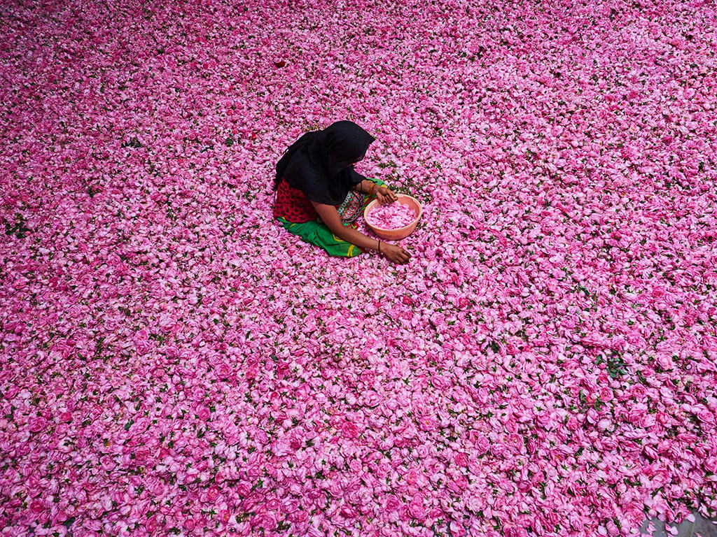 Damask roses are gathered early every day in the area around Kannauj by trained hands and handed to master attar craftsmen.